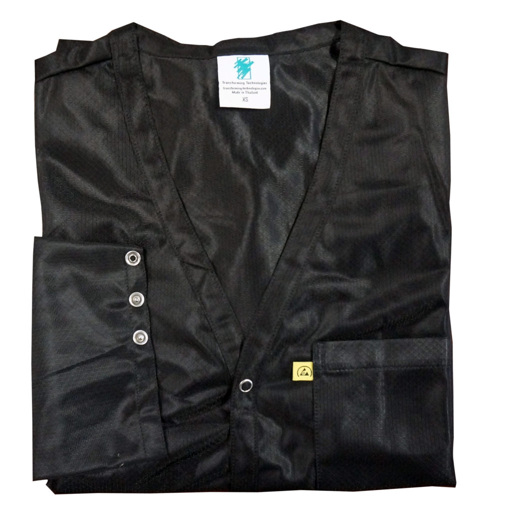 Black ESD Jackets are an excellent choice for your quality control department because they show less stains and dirt, plus everything matches black. Transforming Technologies offers ESD Jackets in our lightweight 8812 ESD fabric and our Medium weight 9010 ESD Fabric. We have several styles:
