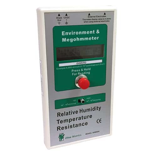 The Ohm METRICS’ SRM500K is a digital surface resistance test kit that accurately measures the resistance of materials and performs ESD tests such as resistance-point-to-point and resistance-to-ground. The Ohm METRICS SRM500K has 10V and 100V selectable test voltage and measures ambient temperature and humidity. The kit is suitable for factory audits, material and test lab evaluations and compliance testing.